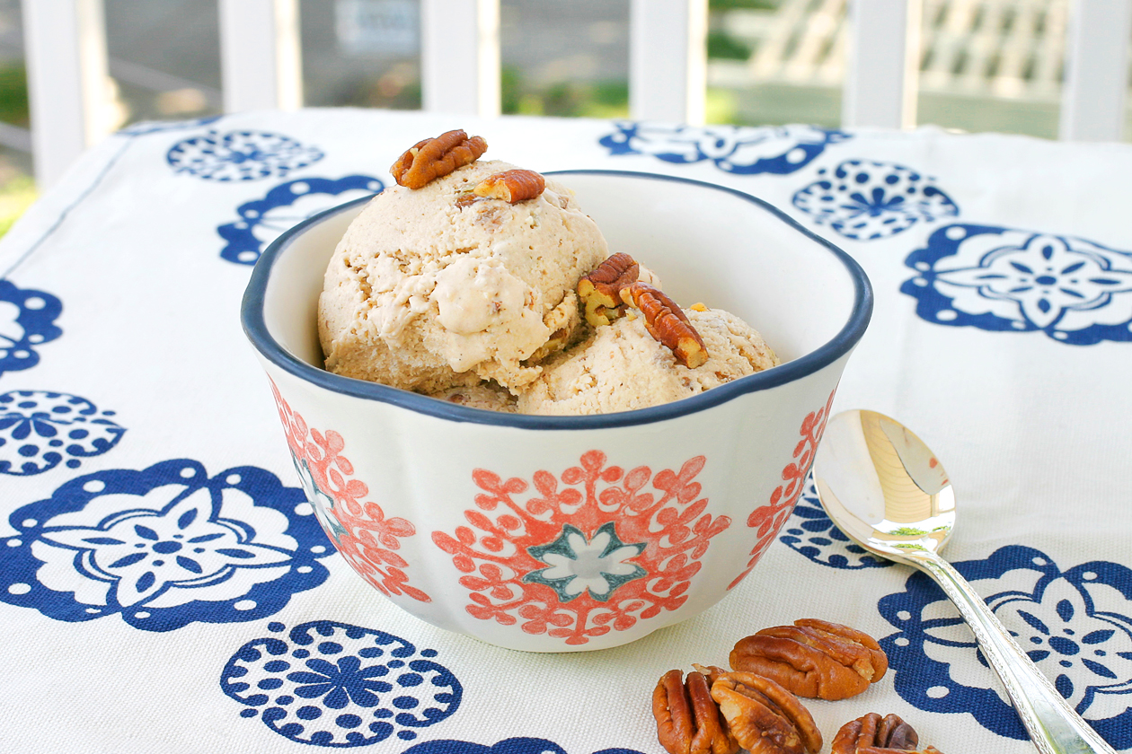 - Pour liquid into your ice cream machine bowl, and churn for about 25 minutes, or according to manufacturer's instructions. The last 5 minutes drop in the remaining pecans. Serve immediately.